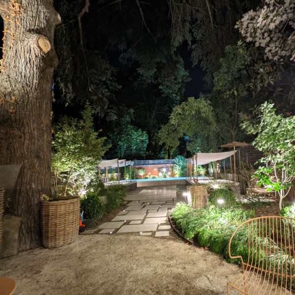 La mise en lumière du jardin a été pensée pour révéler les ambiances nocturnes sans dénaturer l’esprit du lieu. Les cheminements, les zones végétalisées et les espaces de détente sont accompagnés par une lumière douce, maîtrisée et parfaitement intégrée, favorisant la lecture des volumes et le confort des usages nocturnes.