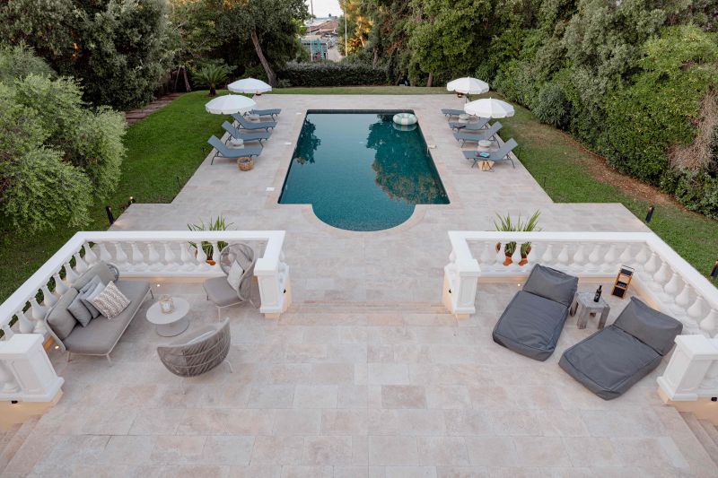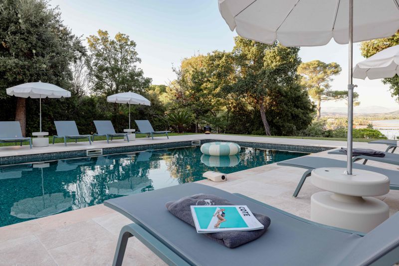L’espace détente autour de la piscine a été pensé comme un lieu intimiste, propice à la relaxation et au bien-être des hôtes.