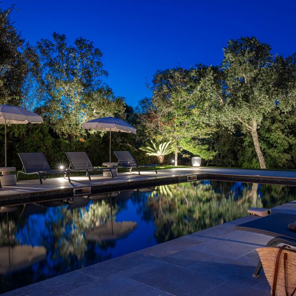 L’écrin de verdure entourant la piscine est mis en valeur par une sélection de luminaires 12 V In-lite, choisis pour leur discrétion, leur fiabilité et leur parfaite intégration paysagère.