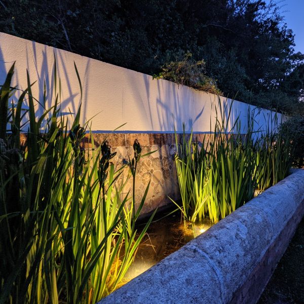 La mise en lumière d’un bassin permet de mettre en valeur la silhouette des plantes et créer des jeux d’ombre et de lumière. Si ce bassin est muni comme ici de jets, l’effet sera encore plus vivant.