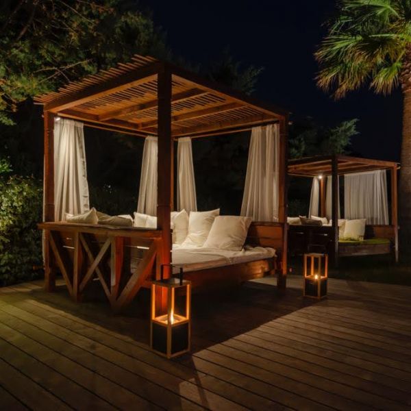 Afin de renforcer l’ambiance lounge/chill, nous avons rajouté des lanternes en teck à gaz (lien ici)