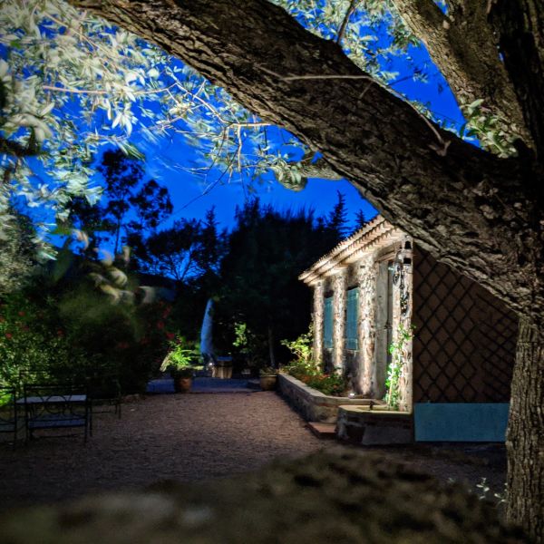 Éclairer les oliviers de l'entrée était une évidence afin de guider les visiteurs et annoncer en douceur le jardin de nuit qui se dévoile.