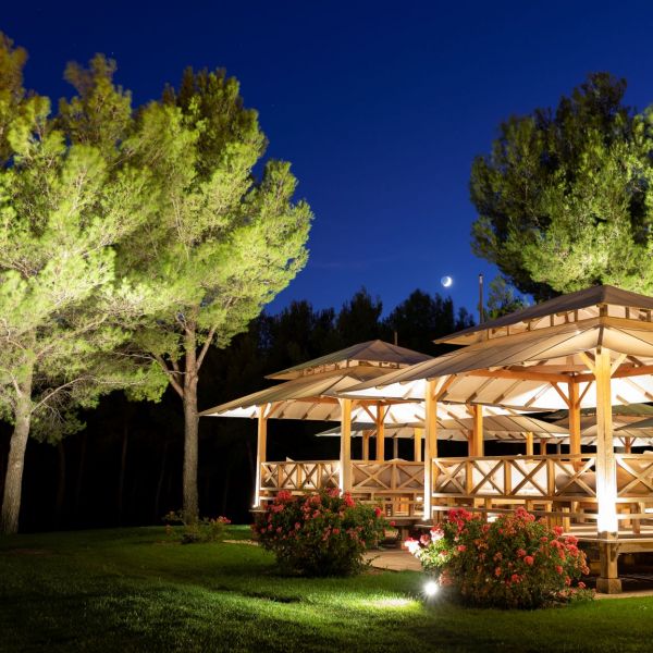 Les gazebo de l'hôtel du Castellet vous invitent à la rêverie dans un lieu magique. La touche finale Quilex a été rajoutée afin d'apporter un éclairage led adapté à la détente et à la plénitude. Une couleur d'éclairage plus chaude assure un moment entre amis des plus intimiste.