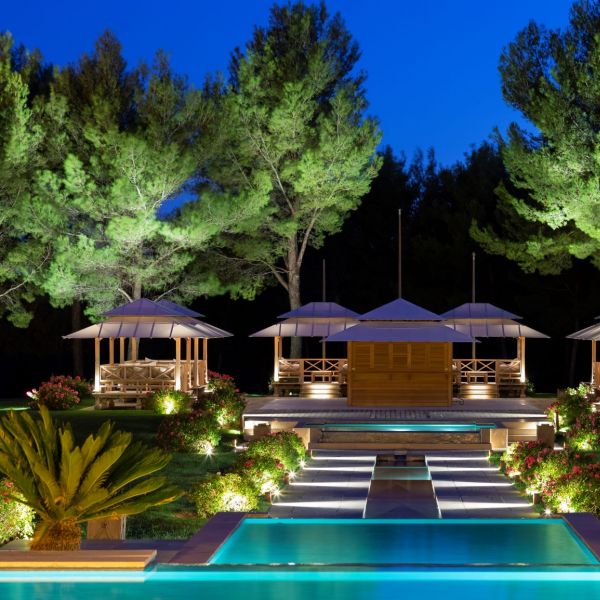 Les pins parasols sont magnifiés, les allées habillées de bornes d'éclairage led en Corten discrètes et élégantes, les pergolas et espaces parking VIP discrètement éclairées.