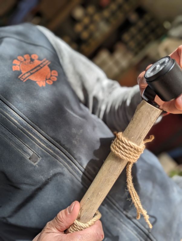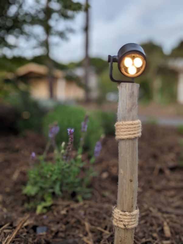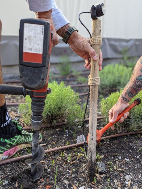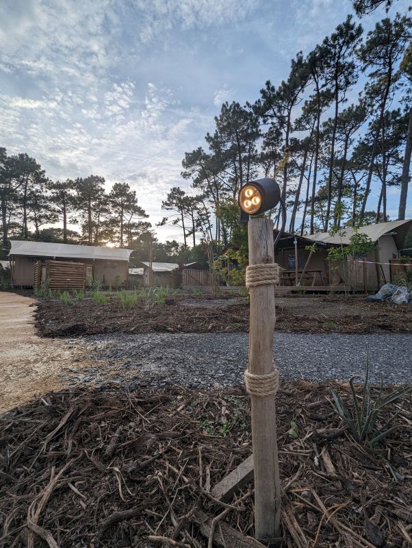 Cette borne d’éclairage en bois flotté (acacia) est plantée dans le sol sans aucun béton ou autres produits chimiques. C’est une volonté d’être le plus éco responsable.